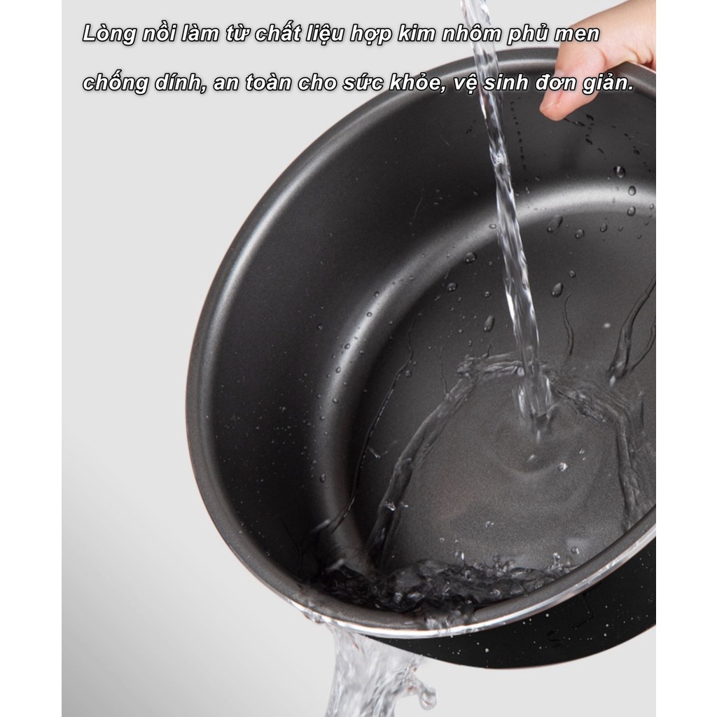- Lòng nồi làm từ chất liệu hợp kim nhôm phủ men chống dính, an toàn cho sức khỏe, vệ sinh đơn giản.