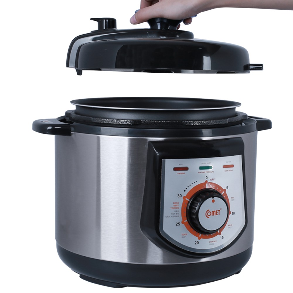 Nồi áp suất Comet dung tích 5L hỗ trợ bạn nấu và hầm các món ăn trong thời gian ngắn, giúp tiết kiệm thời gian và công sức khi nấu nướng. Nồi với 10 chức năng như hầm đậu, thịt bò, gân, xương và nấu các món cơm, canh, súp, cháo…, thức ăn được nấu bằng nồi áp suất sẽ có vị thơm ngon mà không bị mất chất dinh dưỡng. Nồi áp suất Comet còn có thiết bị điều chỉnh nhiệt và nắp khóa an toàn, đảm bảo an toàn tuyệt đối cho người sử dụng.