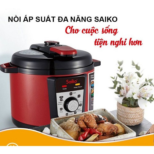 - Nồi áp suất Saiko đi kèm nhiều tính năng như nấu cơm, nấu cháo, nấu súp, hầm
