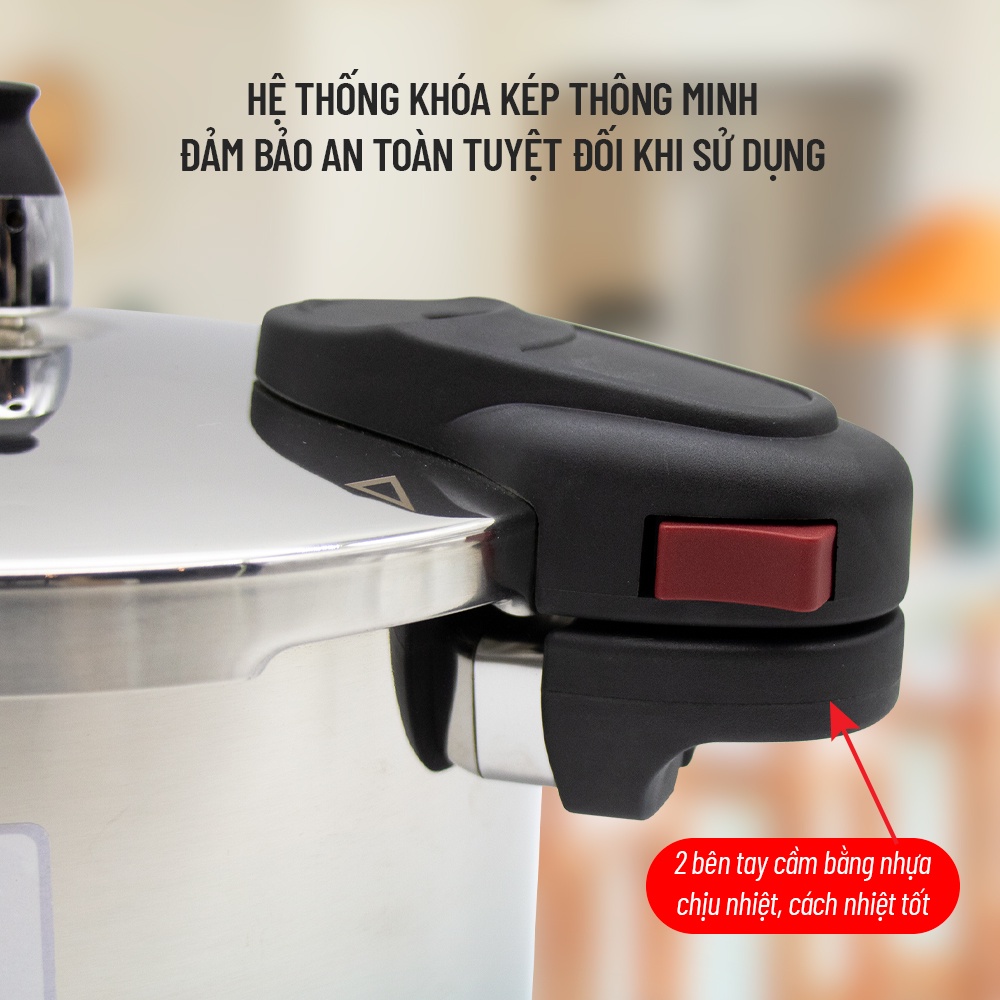 Hệ thống khóa kép thông minh, chỉ mở nắp khi áp suất giảm về ngưỡng cho phép giúp đảm bảo an toàn tuyệt đối khi sử dụng