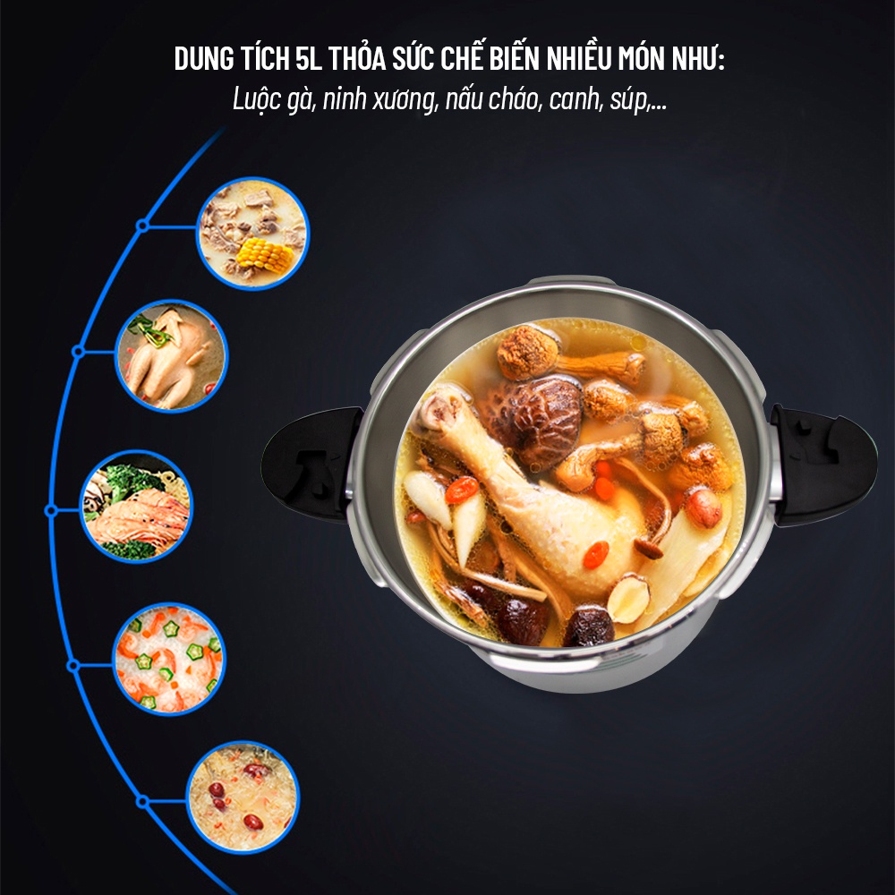 Nắp đậy được trang bị gioăng cao su kín khít kết hợp với Cấu tạo 2 van xả giúp nấu chín thực phẩm nhanh nhừ mà vẫn giữ trọn hương vị và dinh dưỡng của thực phẩm, bồi bổ tốt cho sức khỏe.