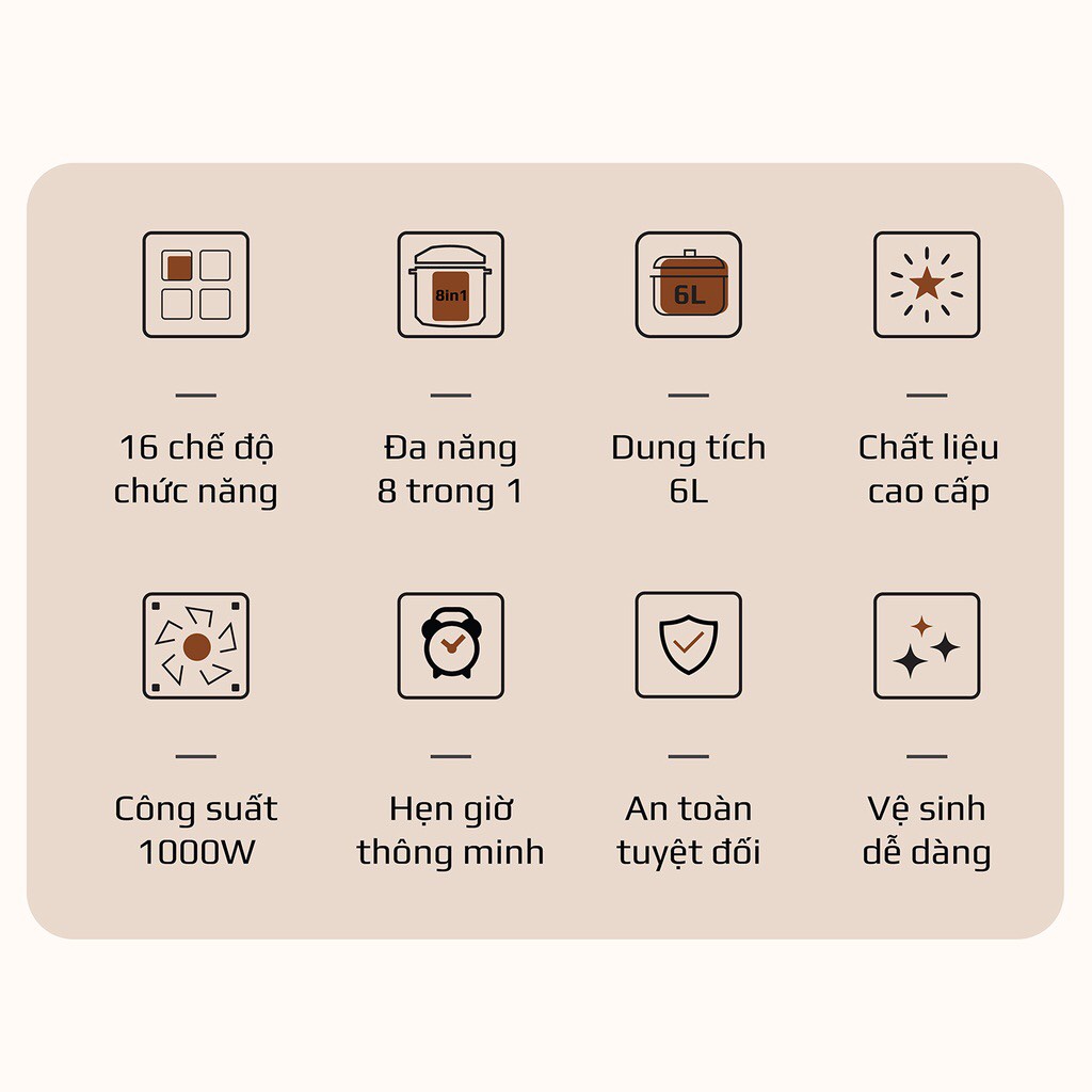 • Thay thế 8 thiết bị nhà bếp: nồi cơm điện, nồi áp suất cơ, nồi nấu chậm, máy làm sữa chua, nồi lẩu, chảo rán, bếp nướng, nồi hấp
