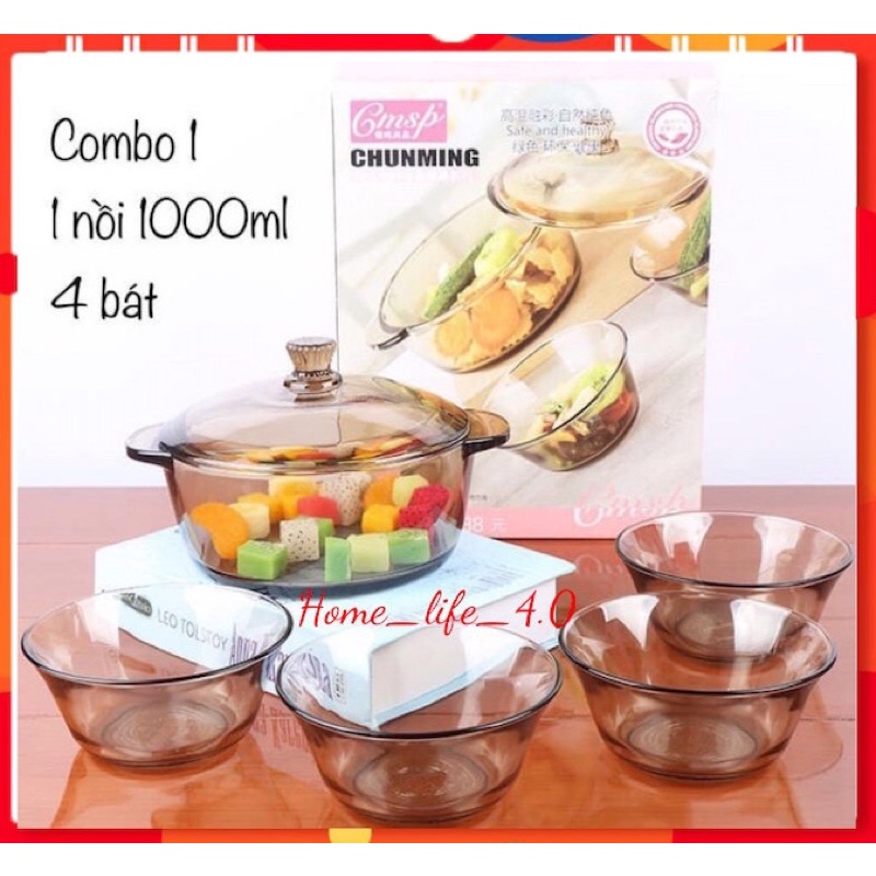 🍀 Bộ 5 món nồi+ bát thuỷ tinh trong cao cấp- Bộ 5 món gồm: 1 nồi thuỷ tinh có nắp đậy và 4 bát thuỷ tinh
