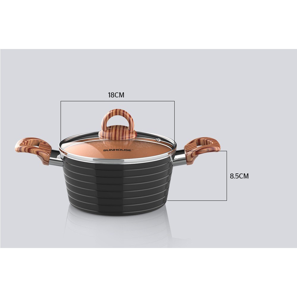 Nồi ceramic đáy từ SUNHOUSE với thiết kế tiện dụng cùng chất liệu đặc biệt sẽ mang đến độ bền và tính thẩm mỹ cao cho căn bếp. Được làm từ nhôm đúc nguyên khối có đáy từ, nồi vừa có độ dẫn nhiệt cao, vừa có thể sử dụng trên các loại bếp từ, bếp hồng ngoại hiện đại để tiết kiệm thời gian nấu nướng. Đồng thời, phần nắp nồi bằng kính cao cấp chịu lực chịu nhiệt tốt, tay cầm và núm vung đều được làm từ chất liệu nhựa phủ silicon vân gỗ chịu nhiệt, chống nóng tay khi sử dụng.Thiết kế tinh tế, sang trọng, bền chắc