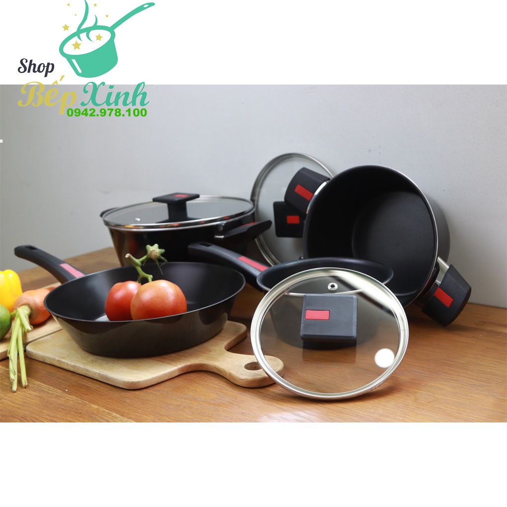 Bộ Nồi Chảo Chống Dính rất được sự tin tưởng của các đầu bếp nổi tiếng trên thế giới, tay cầm bằng nhựa BAKELITE cách nhiệt và chắc chắn Lớp chống dính Ceramic 6 lớp siêu bền, không bong tróc, chống xước tốt, và rửa trong máy rửa bát