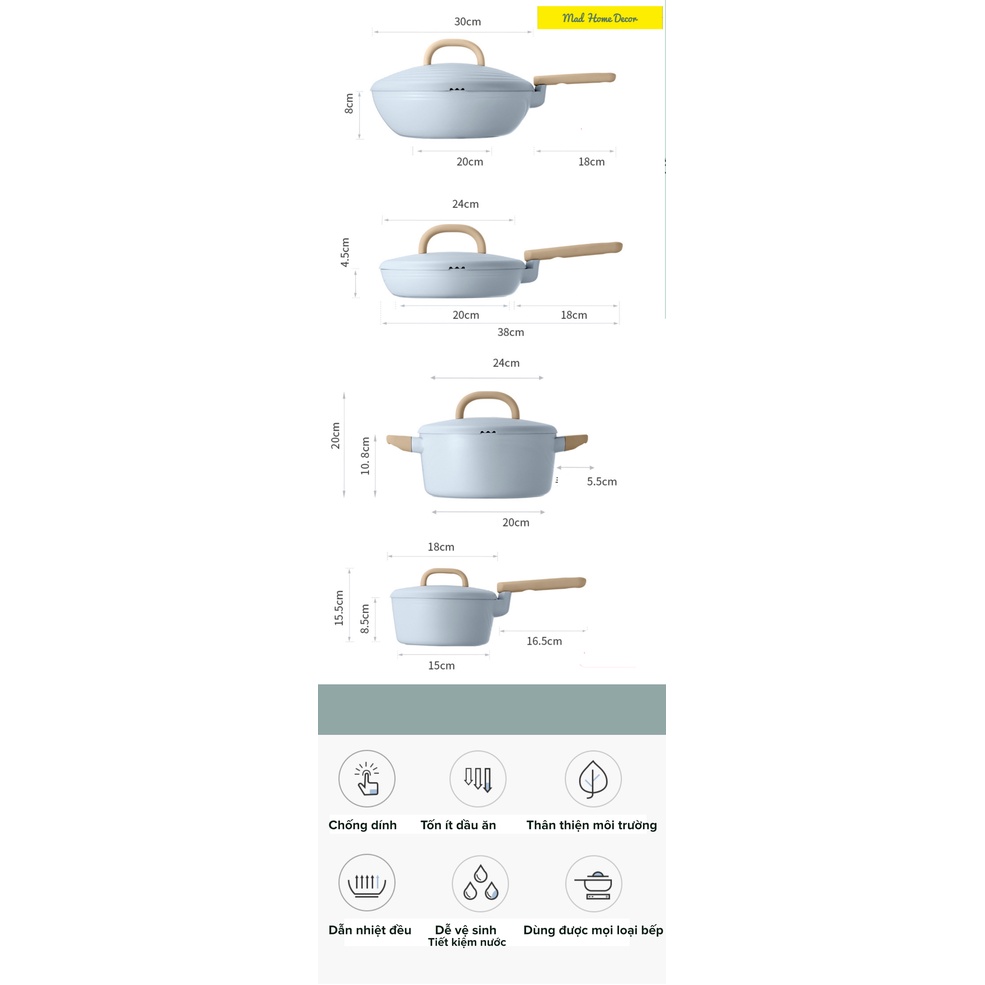 Bộ nồi chảo chống dính mặt đá y tế tay cầm gỗ nắp kính cực xịn xò màu kemBộ nồi chảo gồm 3 món: nồi nhỏ nấu soup, nấu cháo, sữa nóng cho em bé + 1 chảo dán đk 28cm + 1 chảo xào lòng sâu đk 32cm.