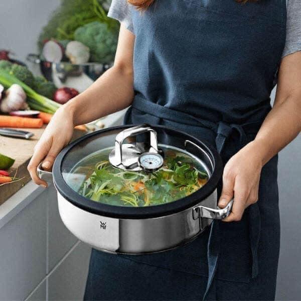 🇩🇪 Nấu ăn trong WMF Vitalis rất nhẹ nhàng với rau, cá và thịt. Nhiệt kế tích hợp trong nắp thủy tinh cho phép điều khiển bên ngoài mà không cần nâng nắp. Do đó, quá trình nấu ăn không bị gián đoạn do mất năng lượng không cần thiết.