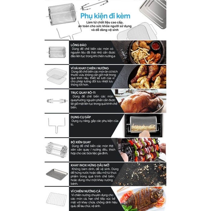 - Phụ kiện: Vỉ nướng, Khay nướng, vỉ nướng cá Lồng đảo, Trục quay Rô-ti, Bộ xiên quay, Khay hứng dầu mỡ
