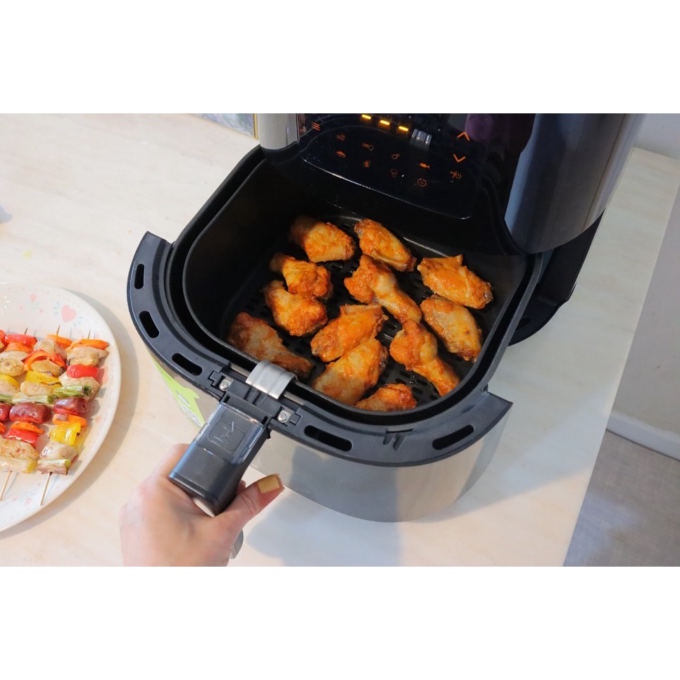 ↝ Phụ kiện: Lồng chiên, đĩa xiên quay, khay hứng dầu, khay chiên, dụng cụ lấy đồ, nhông quay, vỉ nướng chống dính… (mô tả trong sách hướng dẫn đi kèm hoặc có sự thay đổi từ nhà sản xuất)