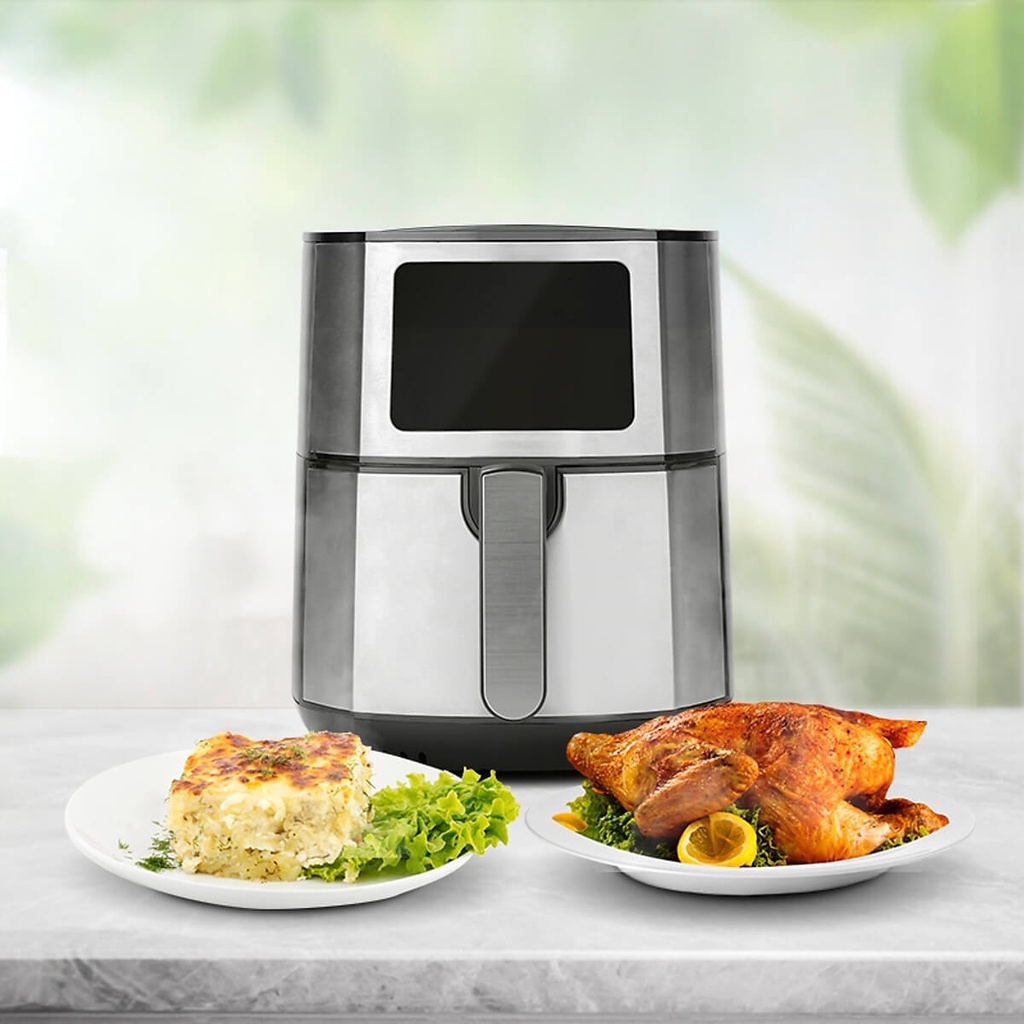 Ngoài ra, khay nướng thiết kế thông minh giúp nhiệt độ lưu thông 360 độ cho thực phẩm vàng đều mà không cần đảo. Bạn không cần sử dụng đến dầu ăn và loại bỏ đến 80% chất béo trong thực phẩm so với cách chiên rán thông thường.