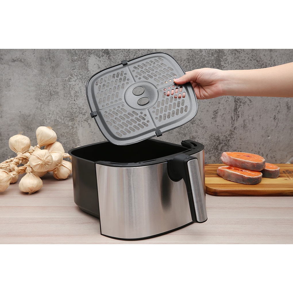 - Mẫu nồi chiên không dầu này được trang bị quạt đối lưu, đưa luồng khí nóng tỏa đều lòng nồi, giúp thực phẩm chín đều, thơm ngon.