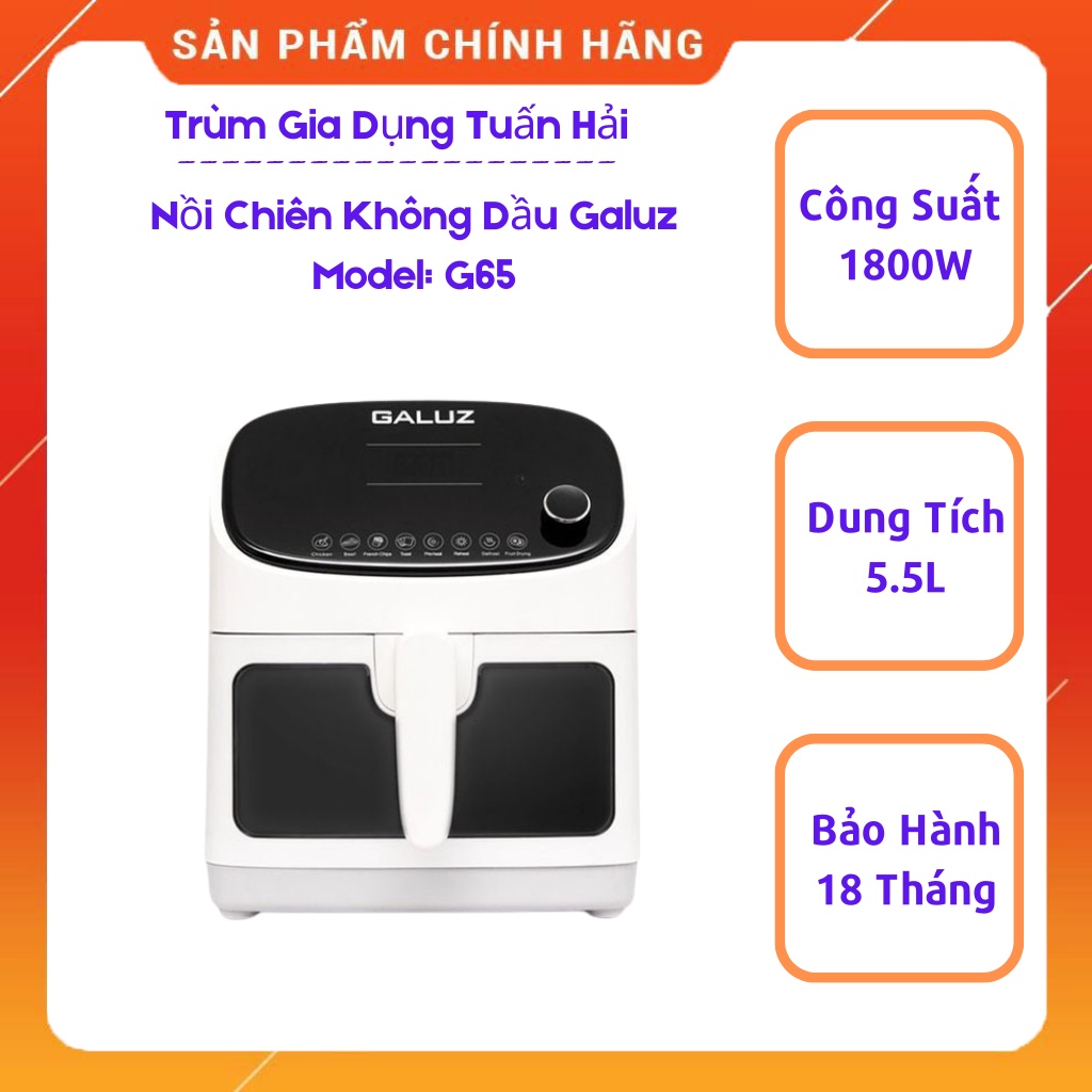 - Không sai khi nói rằng, nồi chiên không dầu Galuz model G-65 là siêu phẩm trong thị trường nồi chiên không dầu. Bởi sản phẩm đã có sự cải tiến đặc biệt, từ cả kiểu dáng và chất lượng sản phẩm