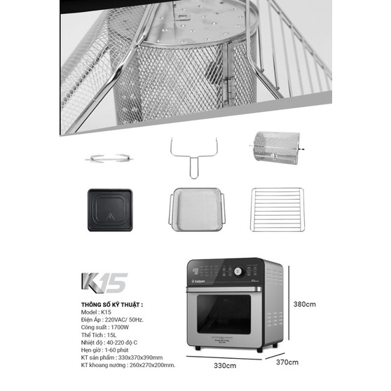 🔥THÔNG SỐ KỸ THUẬT NỒI CHIÊN KHÔNG DẦU DUNG TÍCH 15 LÍT KALPEN K15: