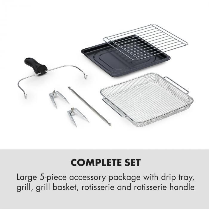 - Bạn có thể chọn được món ăn như mong muốn: khoai tây chiên, bỏng ngô, rã đông, gà (rotisserie), cánh gà, các món rotisserie khác, bánh, sấy khô, bít tết, pizza, khoai tây chiên, giữ ấm, cá, bánh mì nướng, rau và bánh quy là những chương trìnhh có sẵn trong nồi chiên Klarstein Serovital Easy Touch 14L (điện tử).