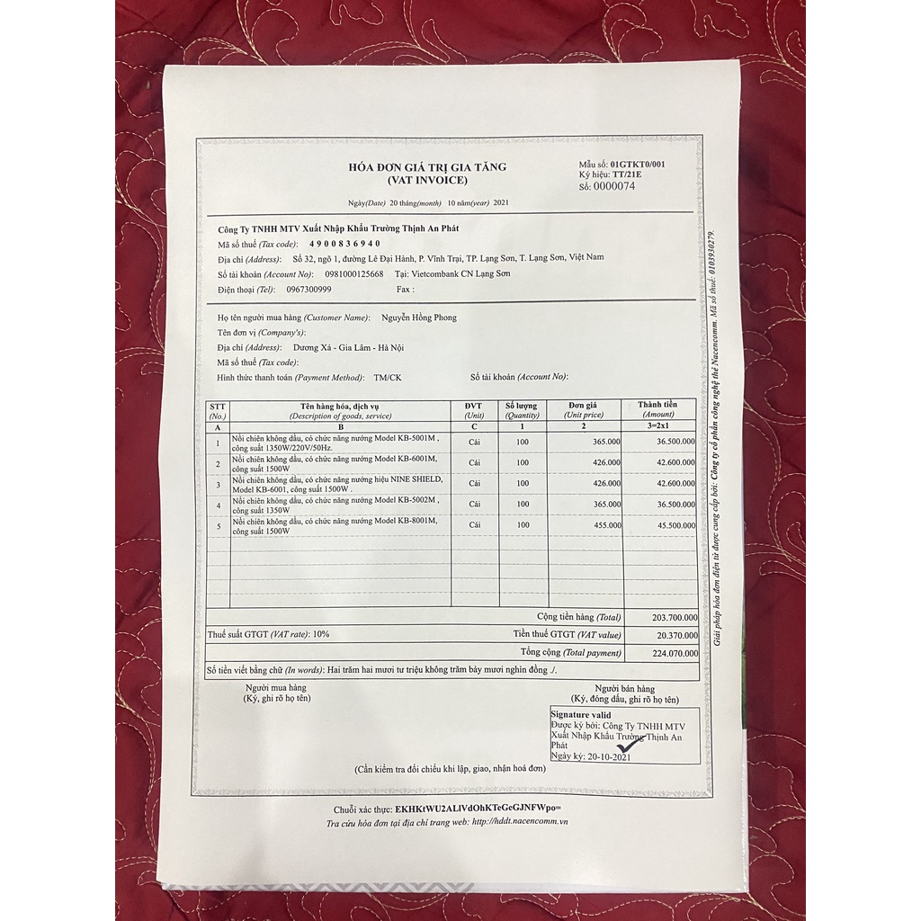 - Công Ty nhập khẩu: Công ty TNHH thương mại Hưng Thịnh Việt Nam