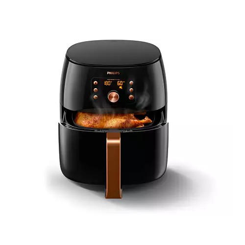 - Nồi chiên Airfryer thế hệ mới của Philips làm điều mà bạn nghĩ. Thưởng thức món chiên thơm ngon, giòn rụm trong 2 bước đơn giản: chọn loại nguyên liệu và nhấn nút nấu. Cảm biến thông minh sẽ tự động điều chỉnh thời gian và nhiệt độ chế biến- Các đầu bếp chuyên nghiệp của chúng tôi đã thiết kế cho Airfryer XXL các cài đặt Nấu ăn thông minh để giúp bạn nấu nướng những món ăn ưa thích, ví dụ như khoai tây tươi hoặc đông lạnh, đùi gà hoặc nguyên con gà và thậm chí là cá nguyên con chỉ với một lần nhấn nút.