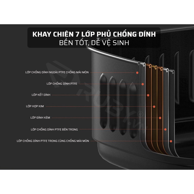 Khay chiên của nồi chiên không dầu được làm từ kim loại composite 7 lớp, có lớp phủ chống dính PTFE hai lớp an toàn, chống mài mòn, dễ lau chùi.