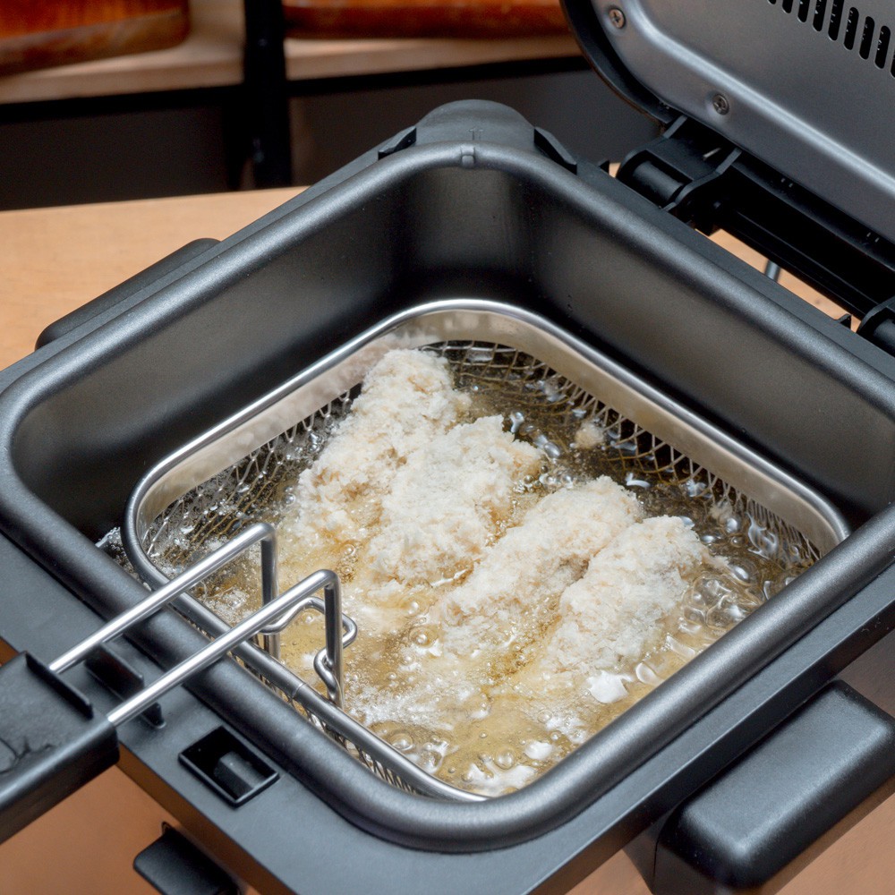 👉 Bạn có thể nâng giỏ chiên lên và làm ráo dầu nhờ vào móc tích hợp trong khi mở nắp.