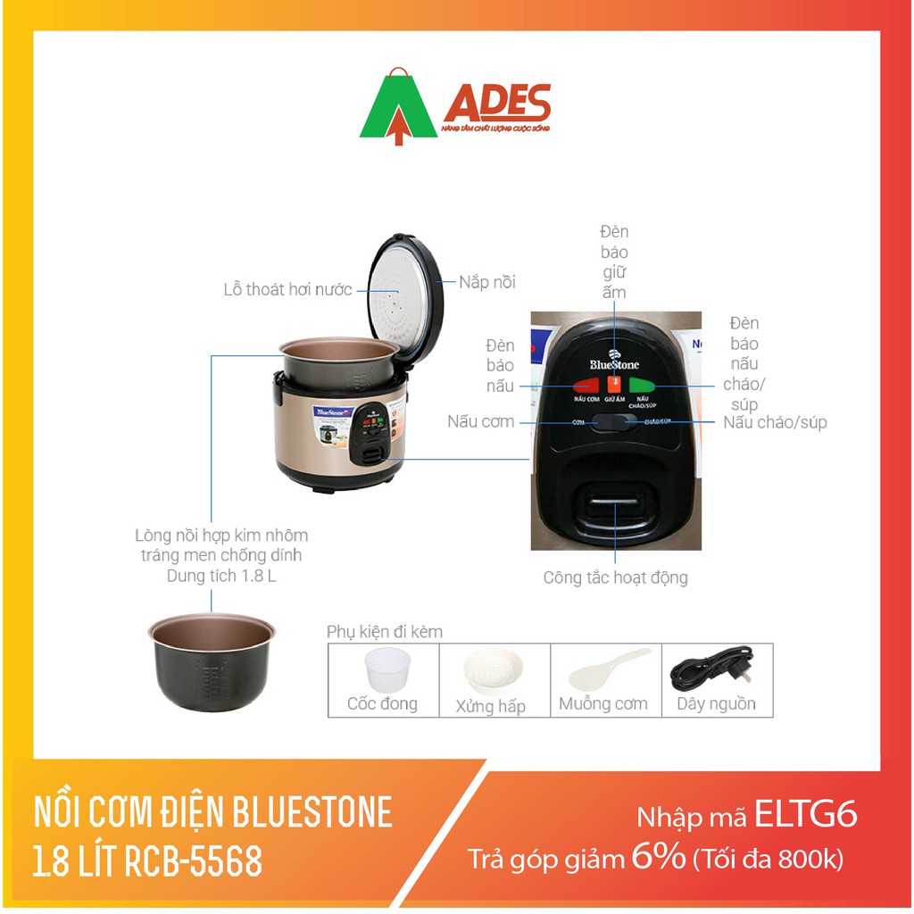 Giới thiệu [Mã 154ELSALE2 giảm 7% đơn 300K] Nồi cơm điện Bluestone 1.8 lít RCB-5568