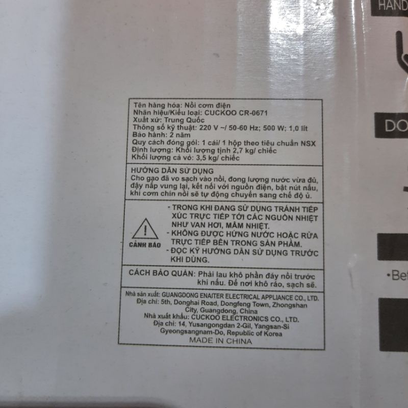 Thiết Bị Điện Gia Dụng > Đồ gia dụng nhà bếp > Nồi cơm điện || NỒI CƠM ĐIỆN CUCKOO CR0671 ( 500W / 1,08L )Còn hàng