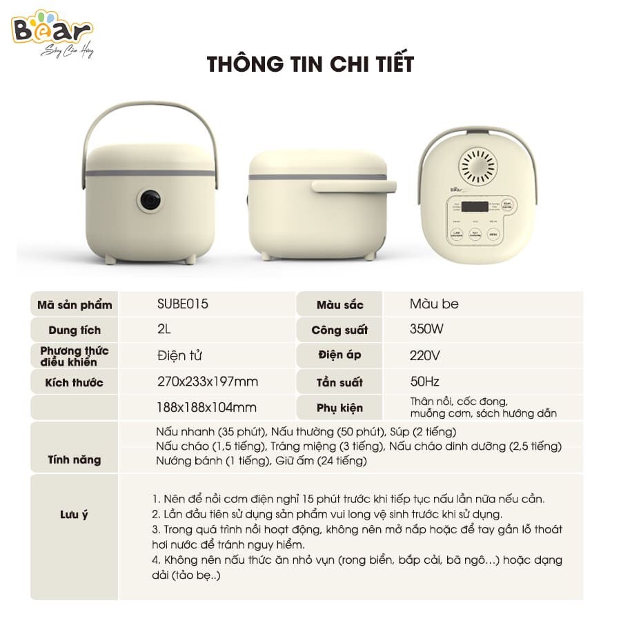 💧Nồi cơm điện Bear nhỏ gọn: Không chỉ mang đến cho khách hàng sản phẩm nồi cơm điện thông minh về mặt tính năng, SUBE015 còn sở hữu thiết kế vô cùng trang nhã và sang trọng. Kích thước nồi cơm nhỏ gọn, dễ sử dụng và phù hợp với nhiều không gian bếp.