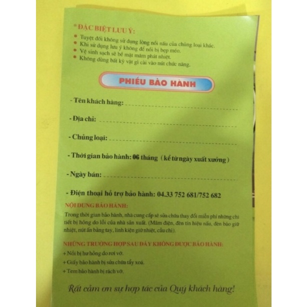 Khi mua nồi về các bạn nên dùng giẻ mềm rửa qua lõi nồi bằng nước rửa bát, sau đó thêm một chút nước vào nồi nấu vừa giúp loại bỏ mùi nồi mới, vừa giúp loại bỏ các bụi bẩn còn sót lại trong quá trình sản xuất. Nếu sản phẩm có vấn đề các bạn liên hệ ngay với shop để được tư vấn bảo hành.