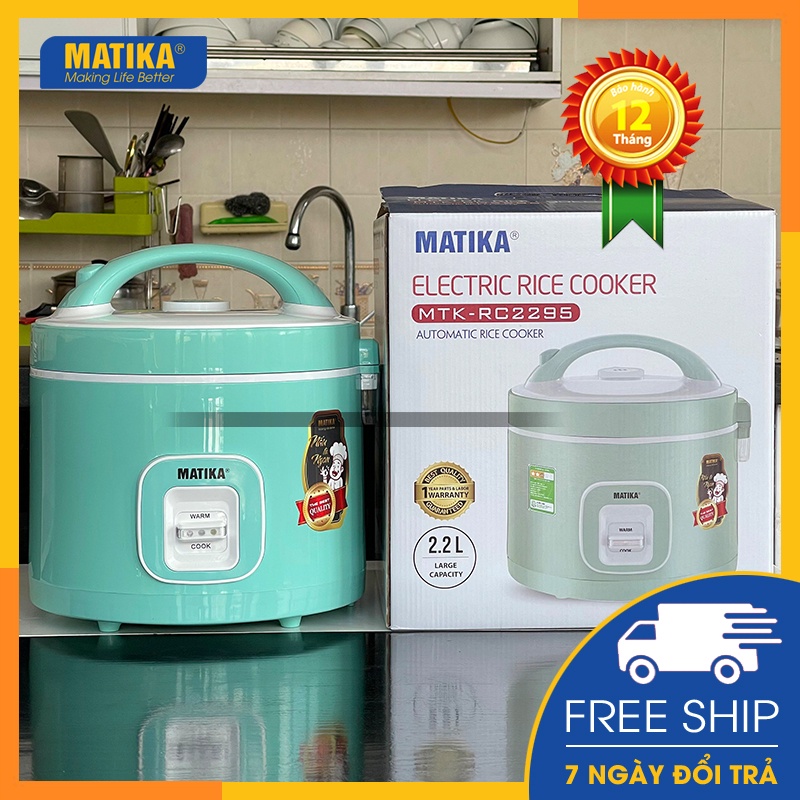 Nồi cơm điện nắp gài 💖 MATIKA 💖 2.2l - 700w thiết kế đẹp MTK-RC2295Nồi cơm điện nắp gài chính hãng Matika MTK-RC2295 dung tích 2.2l, thiết kế nổi bật với màu sắc vô cùng trẻ trung, chức năng nấu hiện đại giúp cơm chín thơm ngon chuẩn vị cho bữa cơm gia đình hạnh phúc.