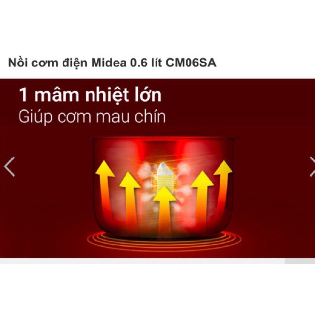 Nồi cơm điện Midea CM06SA dung tích 0.6 lít, thích hợp cho người độc thân, gia đình 2 người. Thiết kế nhỏ gọn, dung tích hợp lý sẽ giúp bạn tiết kiệm điện năng tiêu thụ cũng như làm gọn gàng không gian căn bếp.