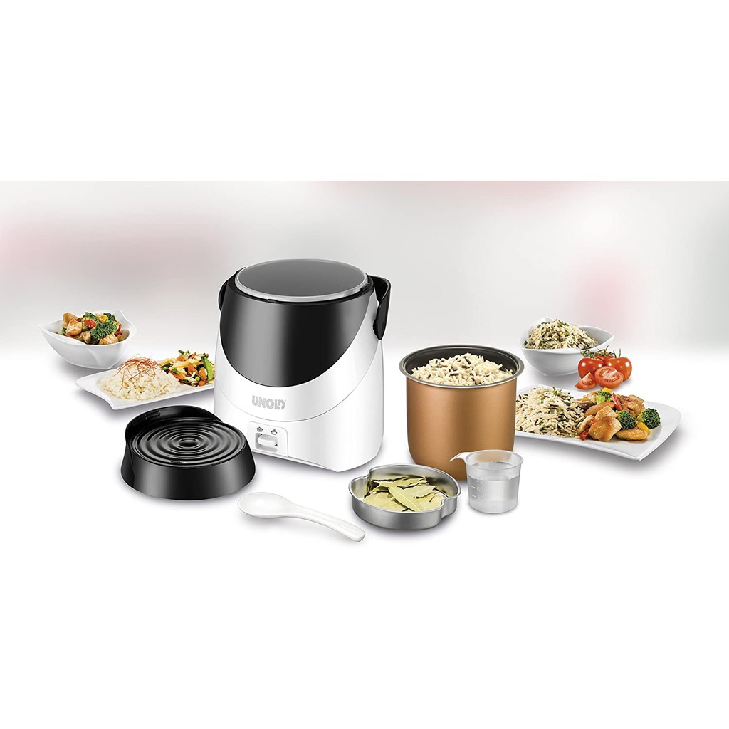 - Đi kèm với nồi cơm điện mini Unold là cốc đong gạo cùng vòng sưởi phân phối nhiệt. Chức năng chủ yếu của vòng sưởi này là giúp điều hòa nhiệt trong nồi để cơm chín thấu, chín mềm và không bị cháy. Lòng nồi có lớp chống dính nên không sợ bị dính thực phẩm vào nồi, dễ vệ sinh. Nồi cơm điện có hệ thống điều khiển cơ, tiện điều chỉnh và sử dụng.