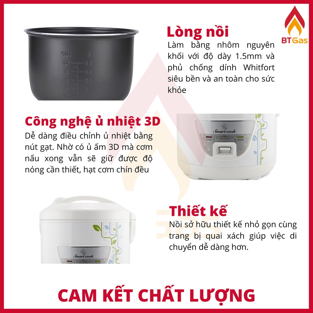 ✔️ Lòng nồi cơm điện cao cấp dày 1.5mm làm bằng hợp kim nhôm nguyên chất, giúp tăng độ bền của nồi gấp nhiều lần. Nồi cơm điện Smartcook nắp gài được trang bị lớp chống dính Whitford siêu bền và an toàn cho sức khỏe.