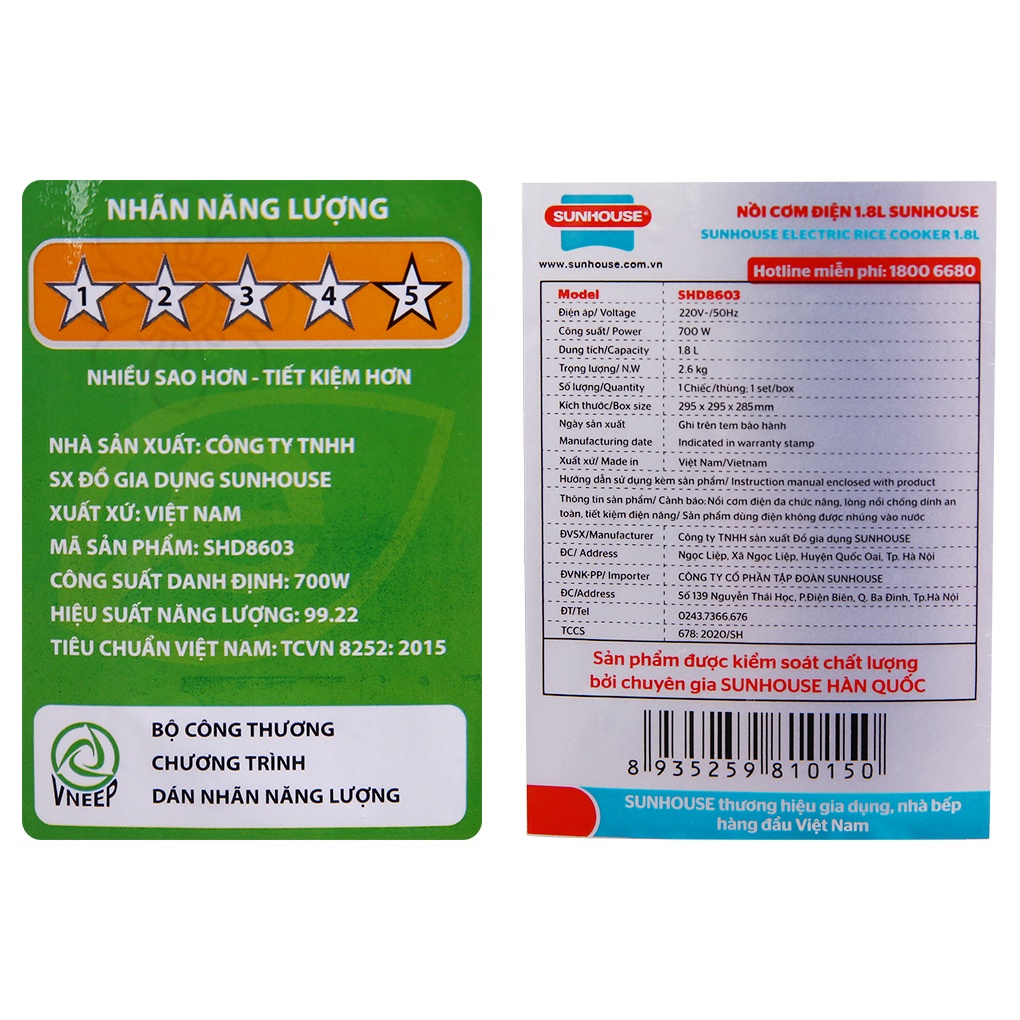 Thông số kỹ thuật Nồi cơm nắp gài Sunhouse 1.8 lít SHD8603Loại nồi: