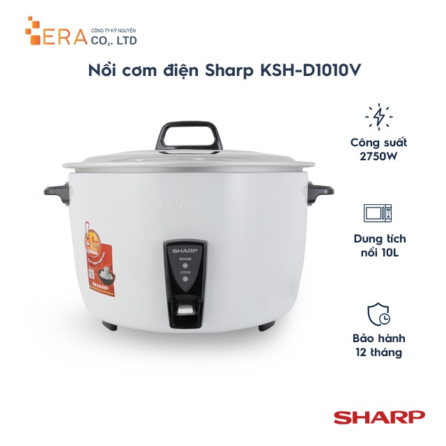 -Nồi cơm điện công nghiệp Sharp KSH-1010V (KSH-D1010V) thiết kế nút bấm cơ dễ dùng, có khả năng giữ cơm ấm lâu đến 5 giờ (khi nấu cơm đầy nồi), mang đến những bát cơm nóng thơm ngon để thưởng thức. Nồi cơm Sharp KSH-1010V (KSH-D1010V) có một mâm nhiệt lớn giúp nấu cơm chín nhanh, ít tốn điện.