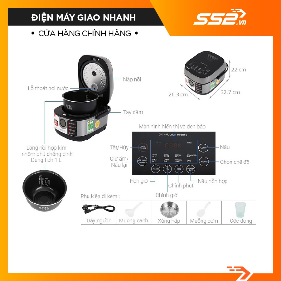 - Nồi có nhiều công dụng như white rice (nấu cơm), sticky rice (xôi), quick/steam (nấu nhanh/ hấp), crispy rice (nấu cơm cháy), brown rice (gạo lứt), congee/soup (nấu cháo/súp), germinated rice (gạo mầm), cake (làm bánh), mixed rice (cơm trộn).