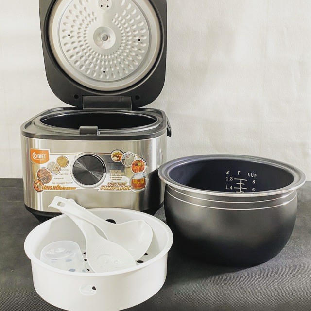 - Nồi cơm điện tử 1,8 lít Comet CM8088 có thiết kế lòng nồi có men chông dính và thành nồi dày 2mm để chống trầy xước khi sử dụng, có khay hấp để sử dụng hấp cách thủy các món ăn.