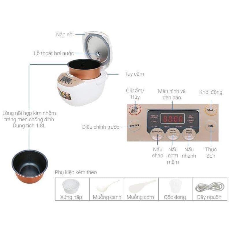 - Nồi cơm điện này hoạt động với công suất cực lớn lên đến 830W, dung tích 1,8 lít cho khả năng nấu cơm nhanh chín, tiết kiệm tối đa thời gian của bạn.