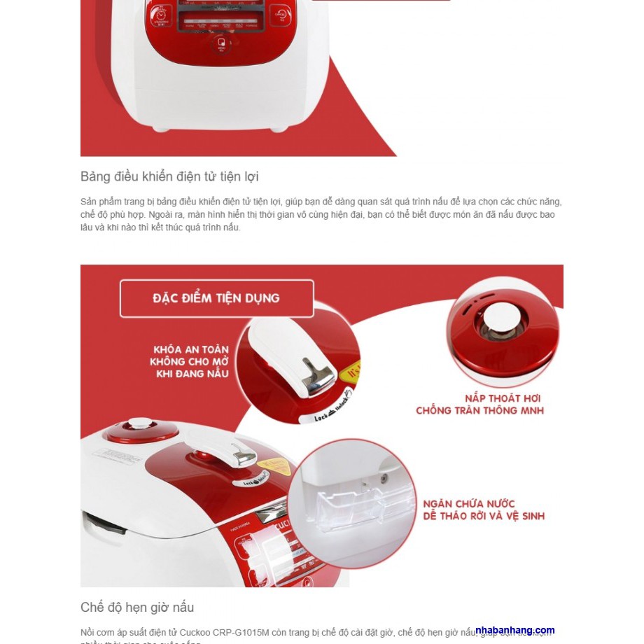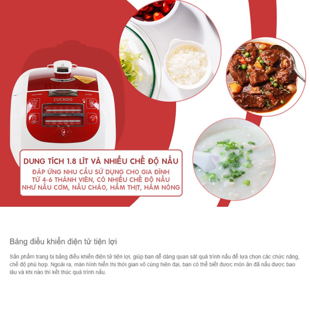 - Nồi cơm áp suất điện tử Cuckoo CRP-G1015M có các chức năng là nấu cơm trắng, nấu gạo hạt dài, nấu cháo, hấp, nấu nhanh… giúp chị em nội trợ nấu ăn phong phú, thuận tiện.