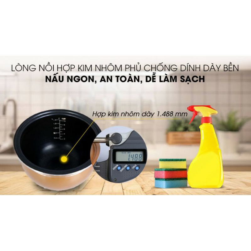 Nồi cơm hoạt động với công suất 900W, nấu chín cơm cực nhanh, giúp gia đình bạn tiết kiệm được thời gian nấu nướng. Lòng nồi có dung tích 1.8L, phù hợp với gia đình từ 4-6 người, lòng nồi được tráng men chống dính đặc biệt, giúp cơm ngon hơn và việc chùi rửa nồi cực nhẹ nhàng.