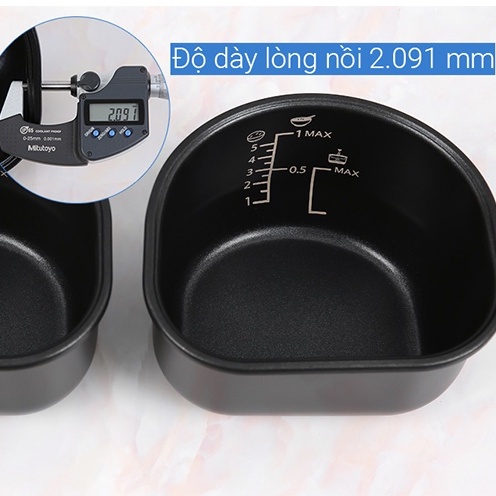 - Lòng nồi 4 lớp, dày 2.091 mm giúp nấu cơm ngon hơn. Chất liệu nồi bằng hợp kim nhôm phủ chống dính dễ dàng vệ sinh