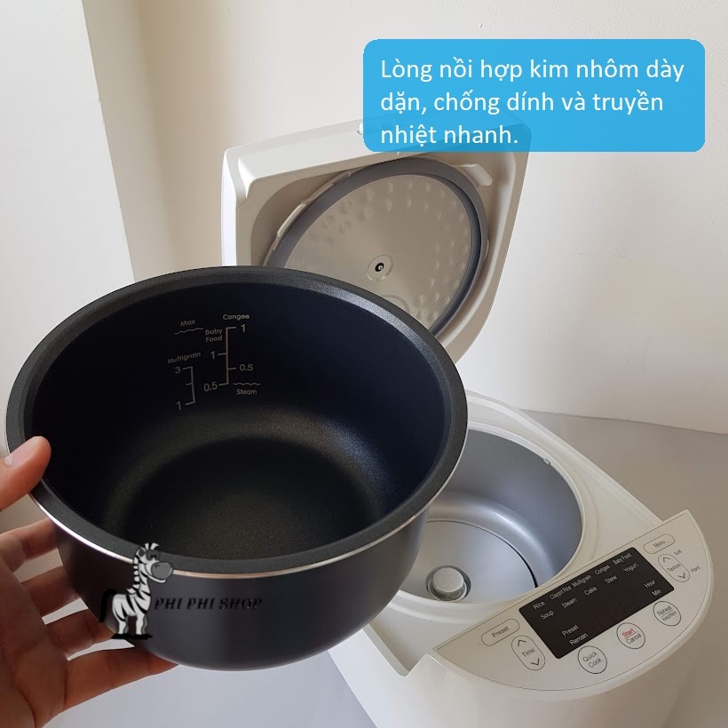 - Chất liệu: lòng nồi làm bằng nhôm, chống dính, giúp truyền nhiệt nhanh và dễ dàng làm sạch