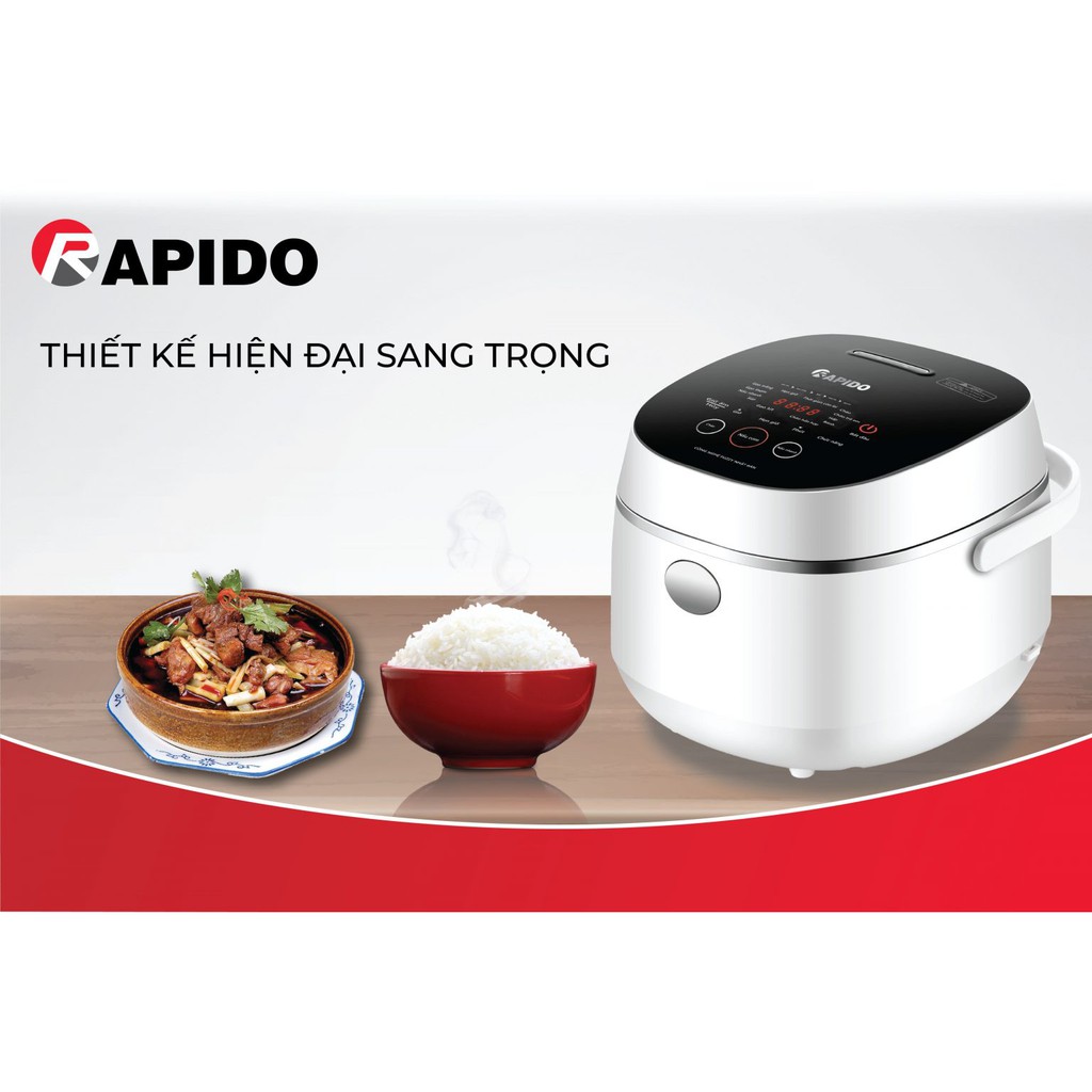 Nồi cơm điện tử Rapido thiết kế sang trọng hiện đại, màn hình điện tử lớn với phím bấm cảm ứng dễ sử dụng. 10 chức năng nấu giúp người dùng có thể dễ dàng nấu nhiều món ăn chỉ với 1 động tác đơn giản giúp tiết kiệm thời gian. Công nghệ Fuzzy Nhật Bản giúp gia nhiệt tuần hoàn, tỏa nhiệt đa chiều 360 độ, kiểm soát nhiệt độ chính xác, giúp giữ trọn vị ngon của món ăn. Đồng thời, van thoát hơi thông minh làm cho lượng nước được thoát ra ngoài một cách hợp lý nhất, nhưng vẫn giữ lại được các vitamin và dưỡng chất có lợi cho cơ thể. Dung tích 1.2L phù hợp với gia đình 2-4 người.