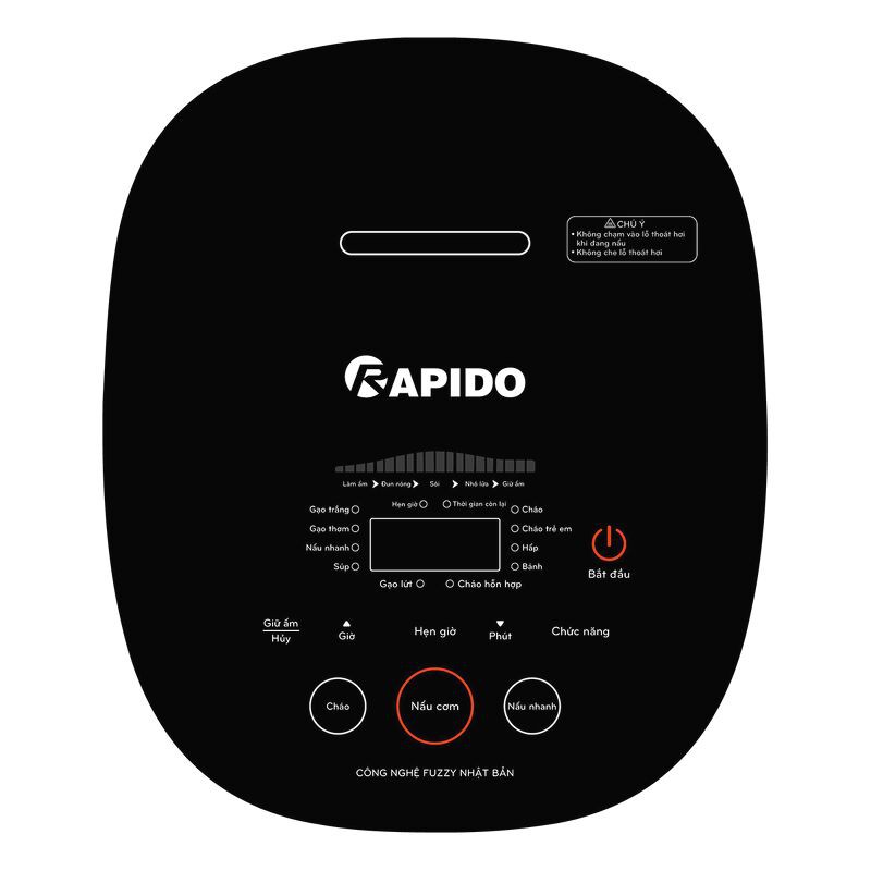 Nồi cơm điện tử Rapido RC-1.2D sở hữu bảng điều khiển điện tử với 10 chức năng nấu được ghi chú rõ ràng bằng tiếng Việt, cảm ứng cực kì tiện lợi cho người sử dụng. Các chức năng nấu từ món đơn giản đến món yêu cầu thời gian và kĩ thuật cao bao gồm: nấu gạo trắng, gạo thơm, nấu nhanh, nấu gạo lứt, nấu cháo, cháo trẻ em, cháo hỗn hợp, hấp, làm bánh. Nồi cơm điện tử Rapido còn có thể hẹn giờ nấu lên tới 24h, tạo sự linh động hơn trong nấu ăn.