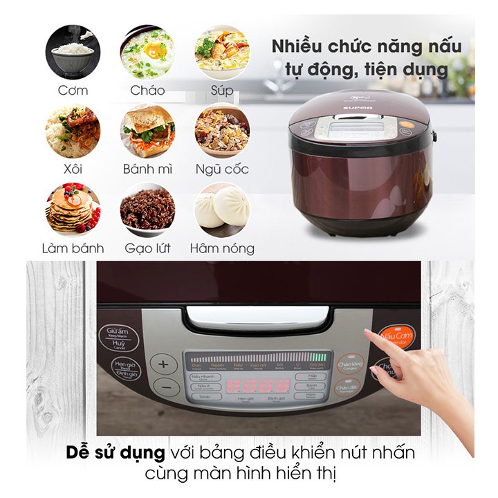 - Nồi cơm điện tử Supor 1.8 lít với thiết kế ấn tượng, cùng màu sắc nổi bật tạo điểm nhấn cho căn bếp. Sử dụng nồi cơm Supor chắc chắn làm hài lòng các bà nội trợ ,mang đến cho gia đình bạn những bữa cơm ngon dẻo và giữ nguyên được chất dinh dưỡng trong hạt gạo. Van thoát hơi thông minh, giữ lại vitamin và dưỡng chất.