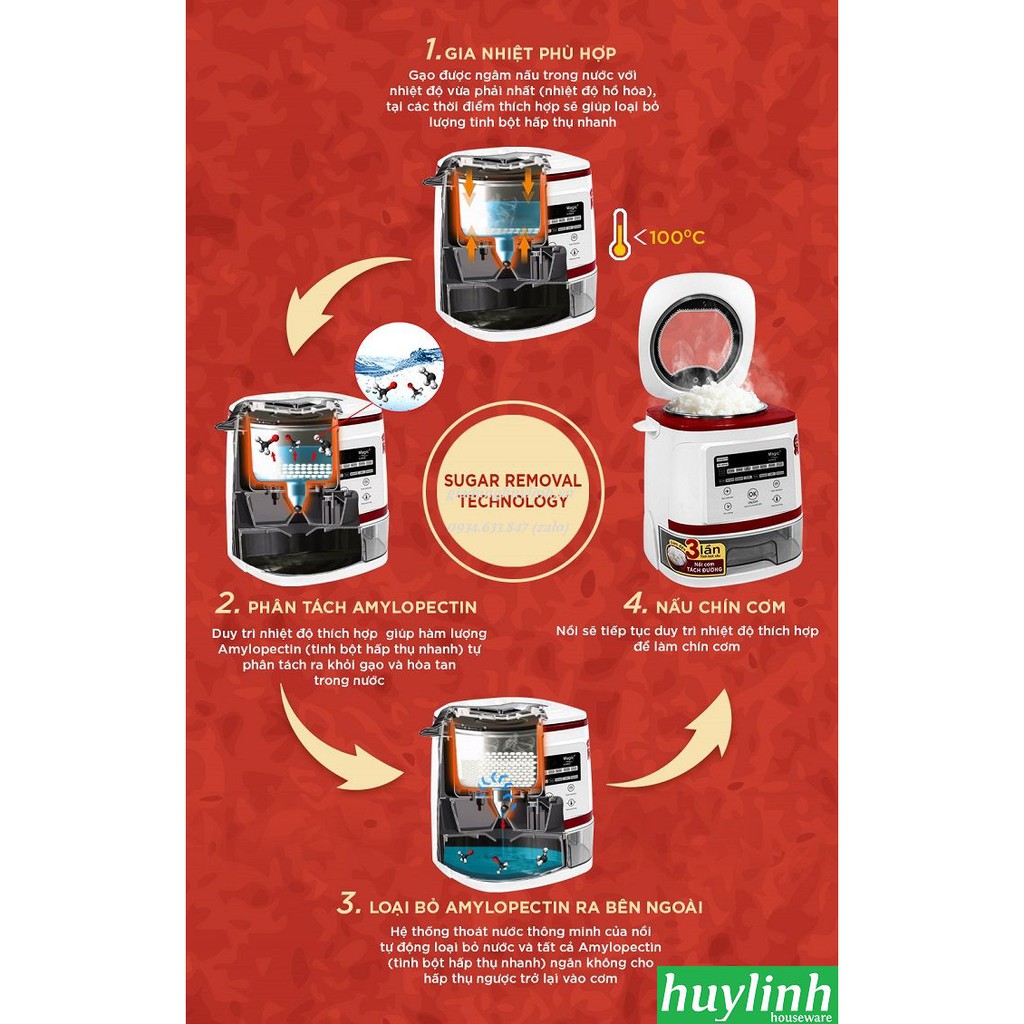 - Sau quá trình phân tách các Amylopectin ra khỏi gạo và hòa tan vào nước một cách tối ưu nhất, hệ thống thoát nước thông minh được tích hợp trong nồi cơm điện tách đường sẽ tự động loại bỏ hoàn toàn nước và tất cả tinh bột tiêu hóa nhanh (RDS) nhằm ngăn chúng hấp thụ trở lại vào cơm, giúp cho cơm sau khi nấu vẫn còn lưu giữ được mùi vị tự nhiên nhưng vẫn lưu giữ được nhiều chất dinh dưỡng vốn có trong gạo.