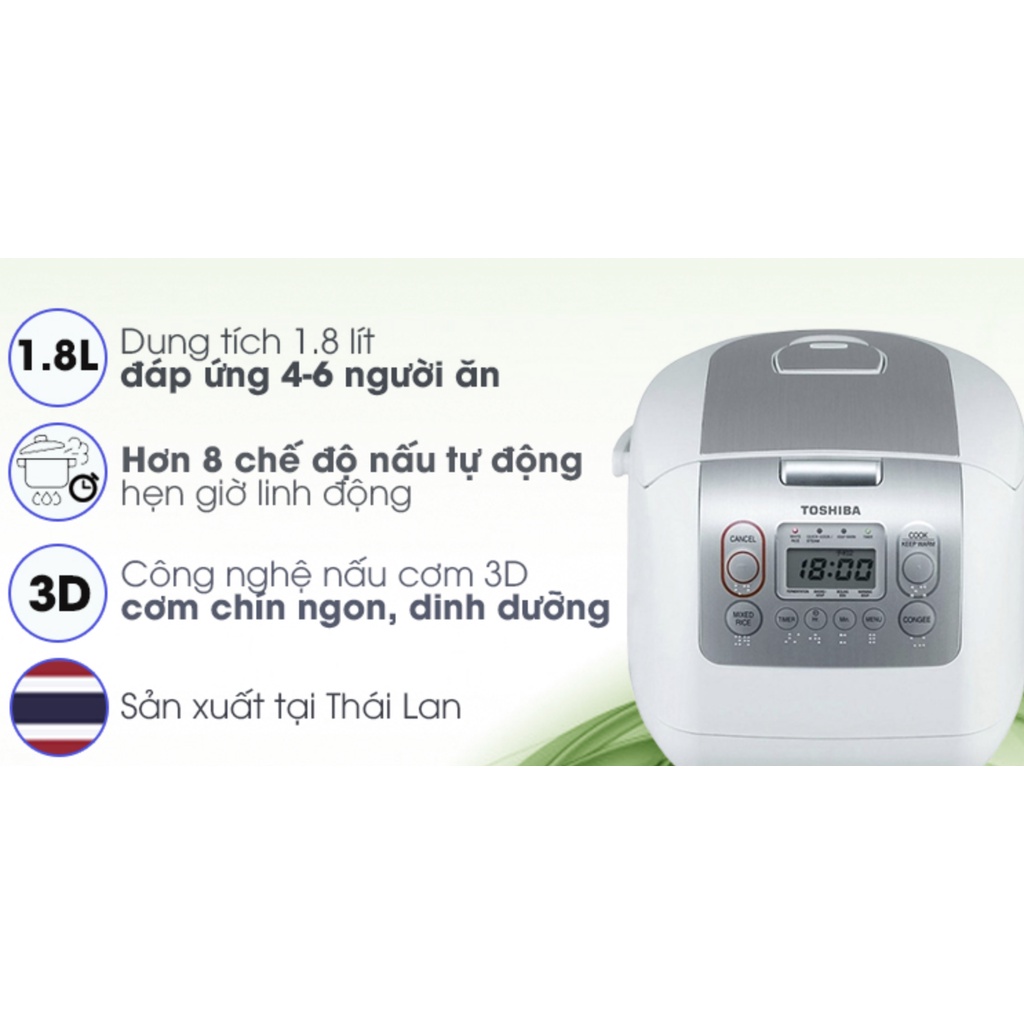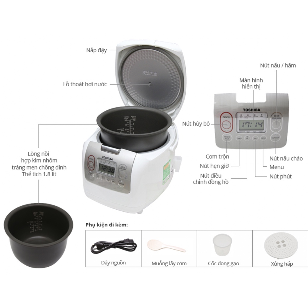 Thông số kỹ thuật Nồi cơm điện tử Toshiba 1.8 lít RC-18NMFVN(WT)Loại nồi:Nồi cơm điện tử