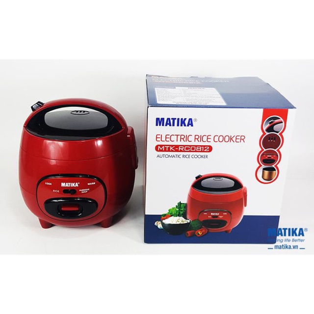 Nồi cơm điện Matika MTK-RC0812 (0.8L) thiết kế đẹp, chức năng nấu cháo, nấu soup cực đỉnhNổi bật với thiết kế đặc biệt cùng tông màu đỏ đun và viền đen tinh tế, nồi cơm điện Matika MTK-RC0812 sở hữu dung tích 0,8L sẽ là chiếc nồi cơm điện mini vô cùng tuyệt vời dành cho 1-2 người.