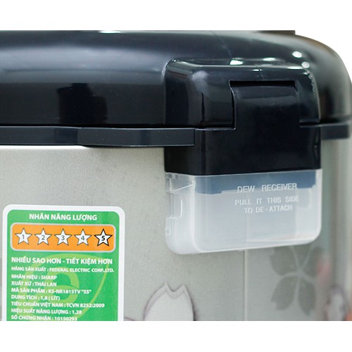 Sản phẩm có thiết kế nắp gài chắc chắn với gioăng cao su phía trong, giúp hơi nước không bị thoát ra bên ngoài, giữ nóng cơm sau khi nấu. Nồi cơm điện nắp gài Sharp KS-NR181STV "SS" tích hợp chức năng cảm ứng nhiệt, sau khi cơm được nấu chín và nhiệt độ đạt mức cho phép, hệ thống sẽ tự động ngắt và chuyển sang chức năng giữ ấm, giúp tiết kiệm điện năng hiệu quả.