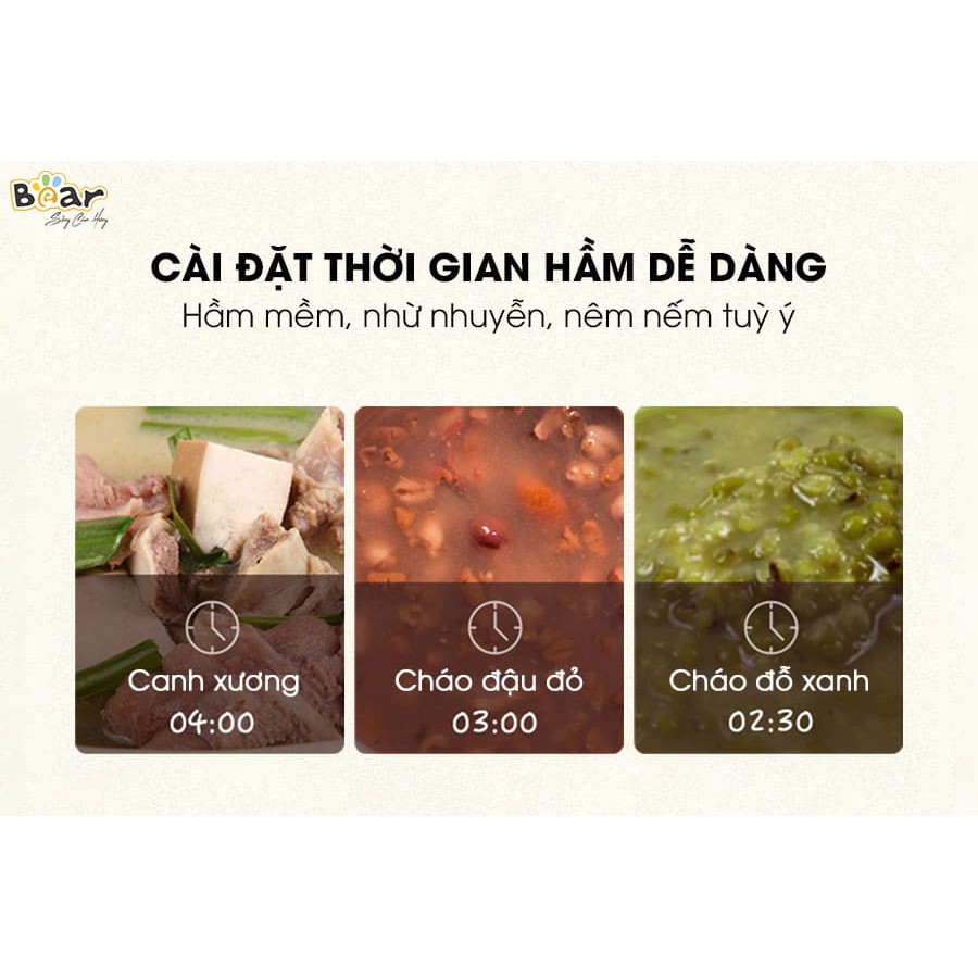 Với thiết kế nhỏ gọn, hiện đại nồi hầm đa năng Bear đảm bảo các tính năng của một nồi hầm và hấp thức ăn chuyên nghiệp với các tiêu chí: Giữ nhiệt tốt, không gây biến tính thức phẩm, dễ dàng vệ sinh, tự động ngắn khi nồi cạn nước để đảm bảo an toàn cho người dùng và độ bền sản phẩm, mang đến cho bạn những trải nghiệm tốt nhất.