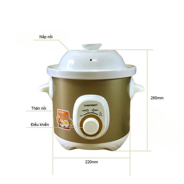 Nồi hầm điện Chefman CM - 520 được sản xuất theo công nghệ Việt, thiết kế sang trọng, vệ sinh nồi dễ dàng, sử dụng lõi nồi bằng sứ an toàn tuyệt đối cho bạn và gia đình vì không sản sinh chất gây nguy hại cho cơ thể,có thể điều chỉnh nhiệt và có tay cầm cách nhiệt tiện dụng.Nồi hầm điện Chefman CM-520 có thể tích 2.5L thiết kế nấu cháo và kho cá chuyên dụng hay được dụng để chưng yến, hầm các món như xương, chim tần…đây là model phù hợp với những gia đình có 6-8 người.