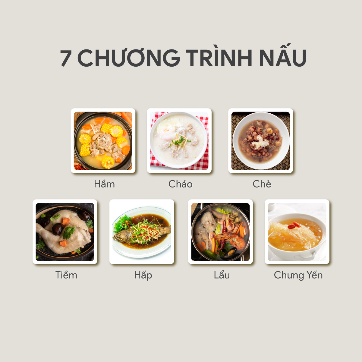 - 7 chương trình nấu: Hầm, cháo, chè, tiềm, hấp, lẩu, chưng yến.