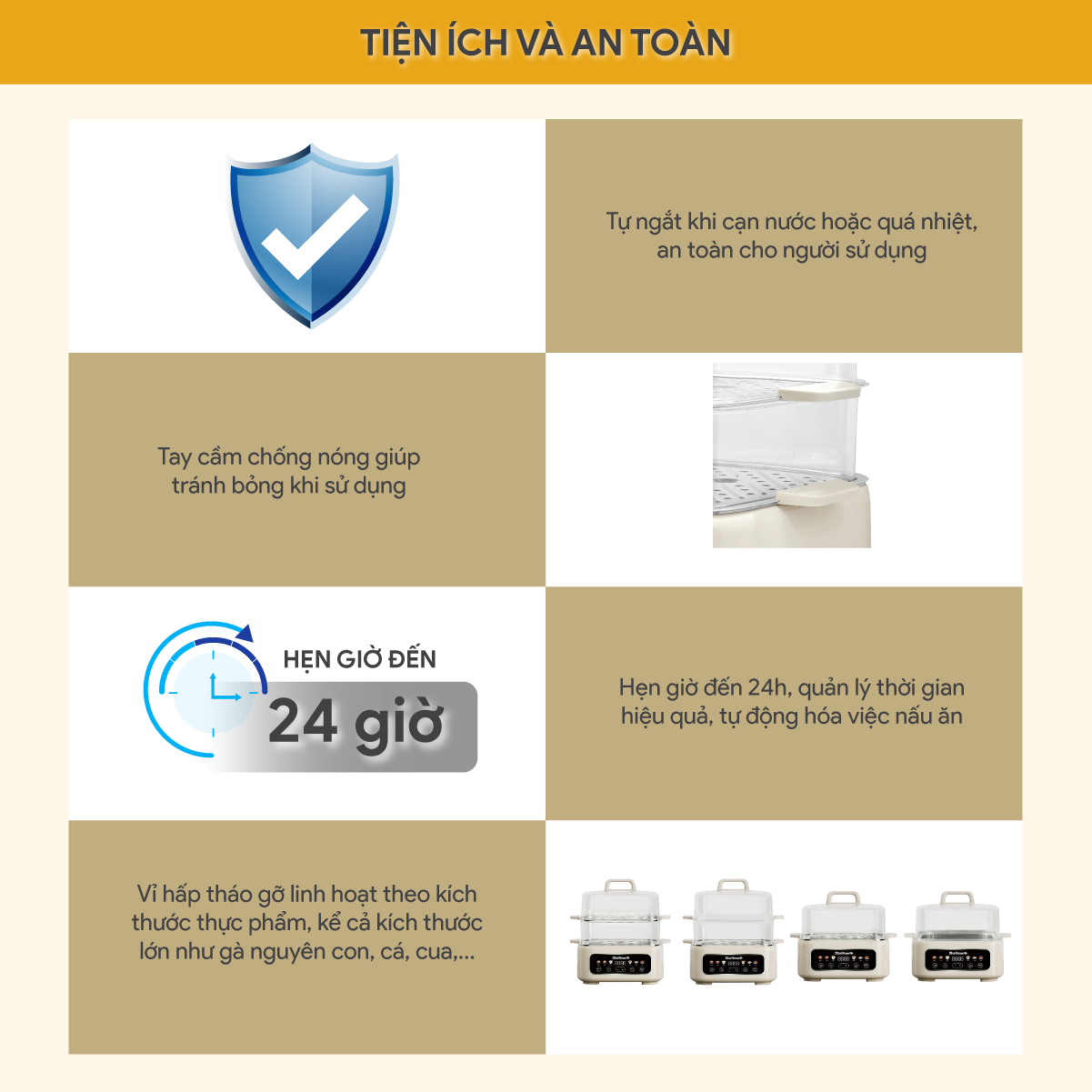- Tiện ích và an toàn: hẹn giờ lên đến 24h, tự ngắt khi quá nhiệt, khi cạn nước.